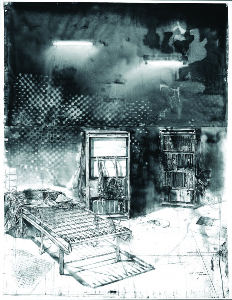 Los interiores que crea son escenarios medio abandonados: espacios cargados de objetos en desuso —viejos televisores, cajas, trapos, periódicos acumulados, cables eléctricos— que, bajo su mirada, adquieren un carácter simbólico. Estas composiciones, sostenidas por una minuciosa técnica, alternan entre la realidad y la abstracción, la penumbra y los destellos lumínicos, y construyen una arqueología cultural donde lo caduco se transforma en metáfora. La aparente inutilidad de esos objetos se resignifica en imágenes que revelan su densidad poética y metafísica.