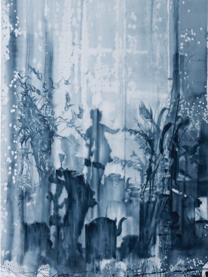 En su obra reciente, Vaquero vuelve a la idea del color como una superficie inestable. Grandes fondos de tonos fragmentados —azules, dorados— se convierten en protagonistas, en campos de energía donde los objetos se fragmentan y revelan su inmaterialidad. La pintura es accidente, rectificación, gesto deliberado, huella del tiempo sobre la materia.
