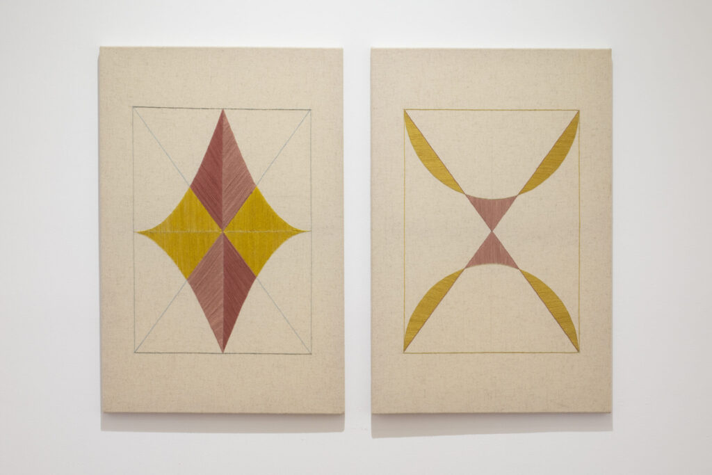 Es notable la poética del silencio y del arraigo en Resonancias de la montaña, donde el gran montículo vibra desde la tierra y dialoga con el cuerpo humano; por medio de sus gobelinos y bordados geométricos, la artista registra ese pulso en una progresión de 9, número cargado de simbolismo cabalístico. «Existe una expansión y contracción, al igual que los latidos del corazón», describe Carrillo, subrayando que el acto de bordar es también una forma de meditación rítmica. En ese tributo a la elaboración textil se vislumbra una ofrenda a la propia vida.