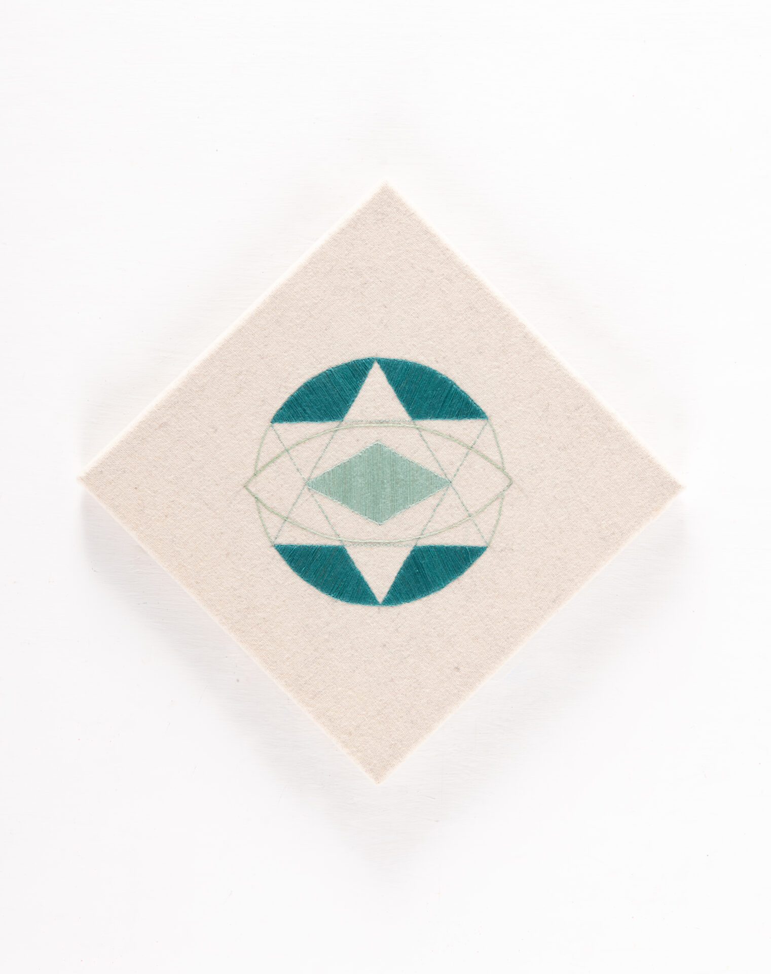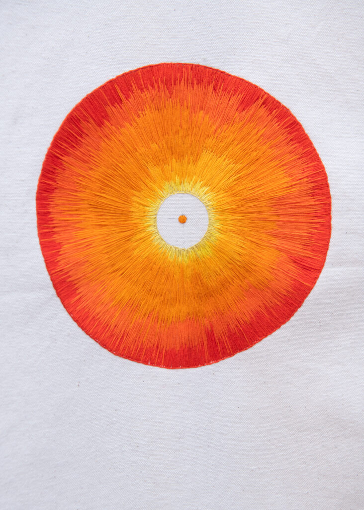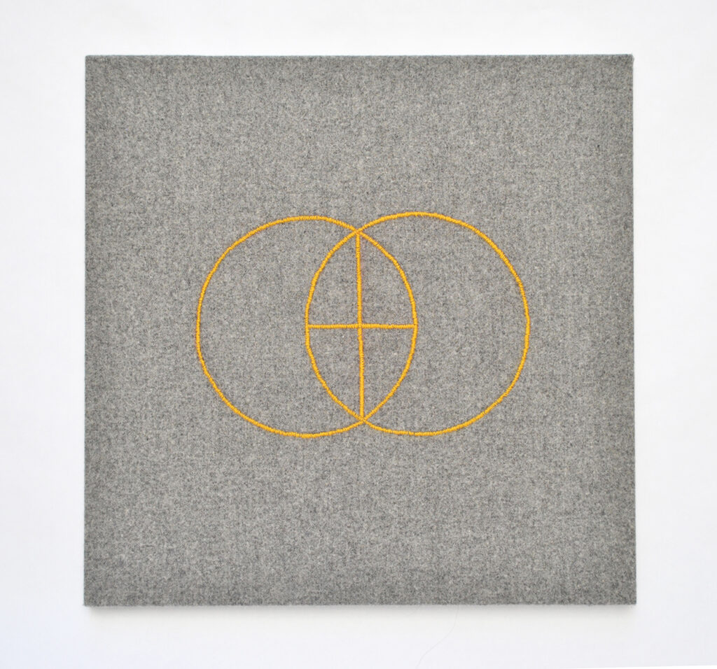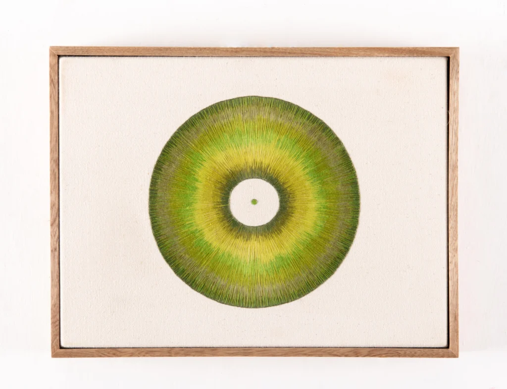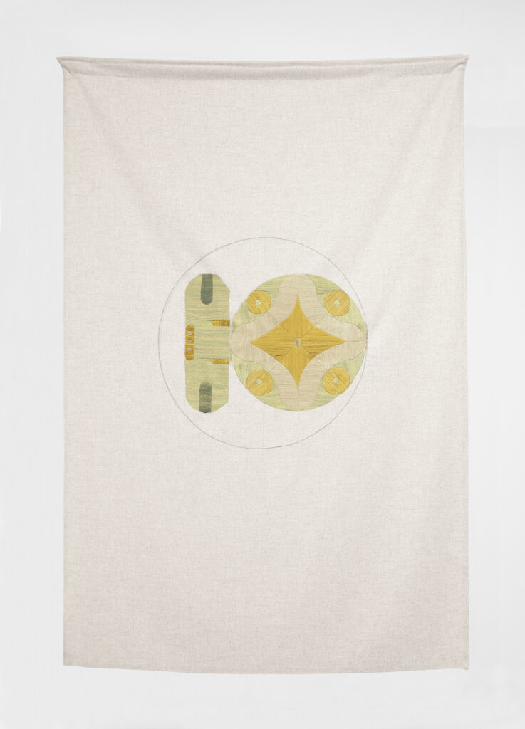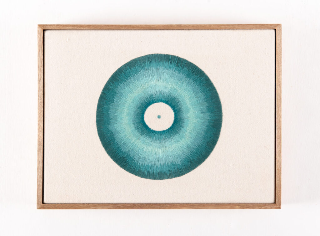 La serie Frecuencias, por ejemplo, parte del principio circular como génesis de toda existencia física: la célula se divide, el patrón geométrico se multiplica y el movimiento microscópico se conecta con la inmensidad. Isa Carrillo convierte ese flujo vital en una interpretación visual del universo como red de resonancias. La geometría sagrada se vuelve una vibración materializada: el cosmos susurra a través de la aguja y el hilo.